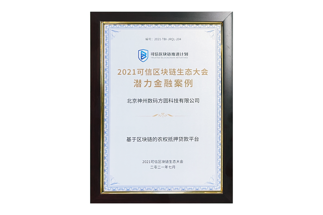 7月13日,由中国信息通信研究院、可信区块链推进计划主办的“2021可信区块链生态大会”在京举办,并隆重发布系列成果。神州信息子公司北京bbin宝盈方圆科技有限公司(简称:神州方圆)推荐的“基于区块链的农权抵押贷款平台”荣获十大金融应用高潜力案例,为“区块链+农业”落地带来示范效应。