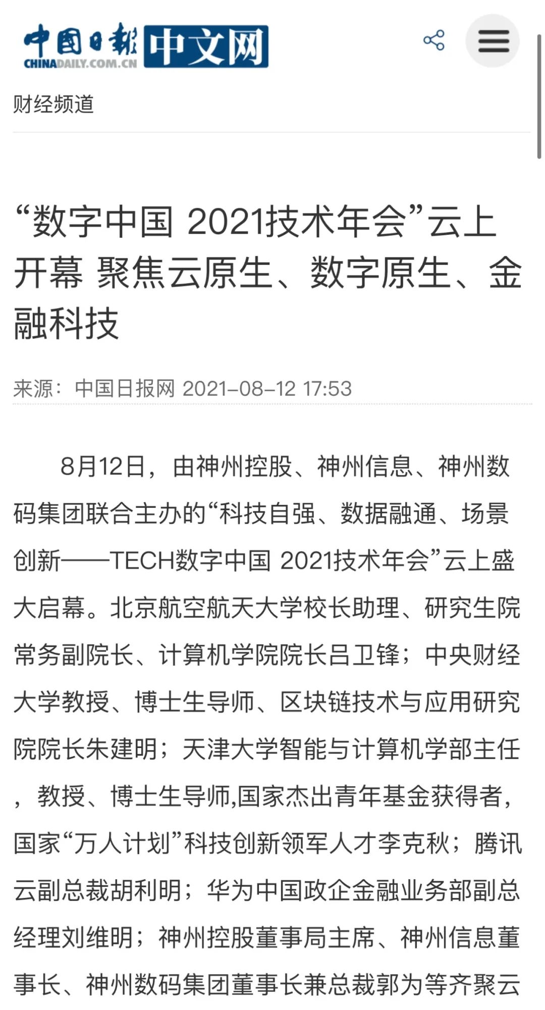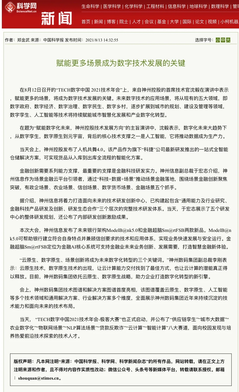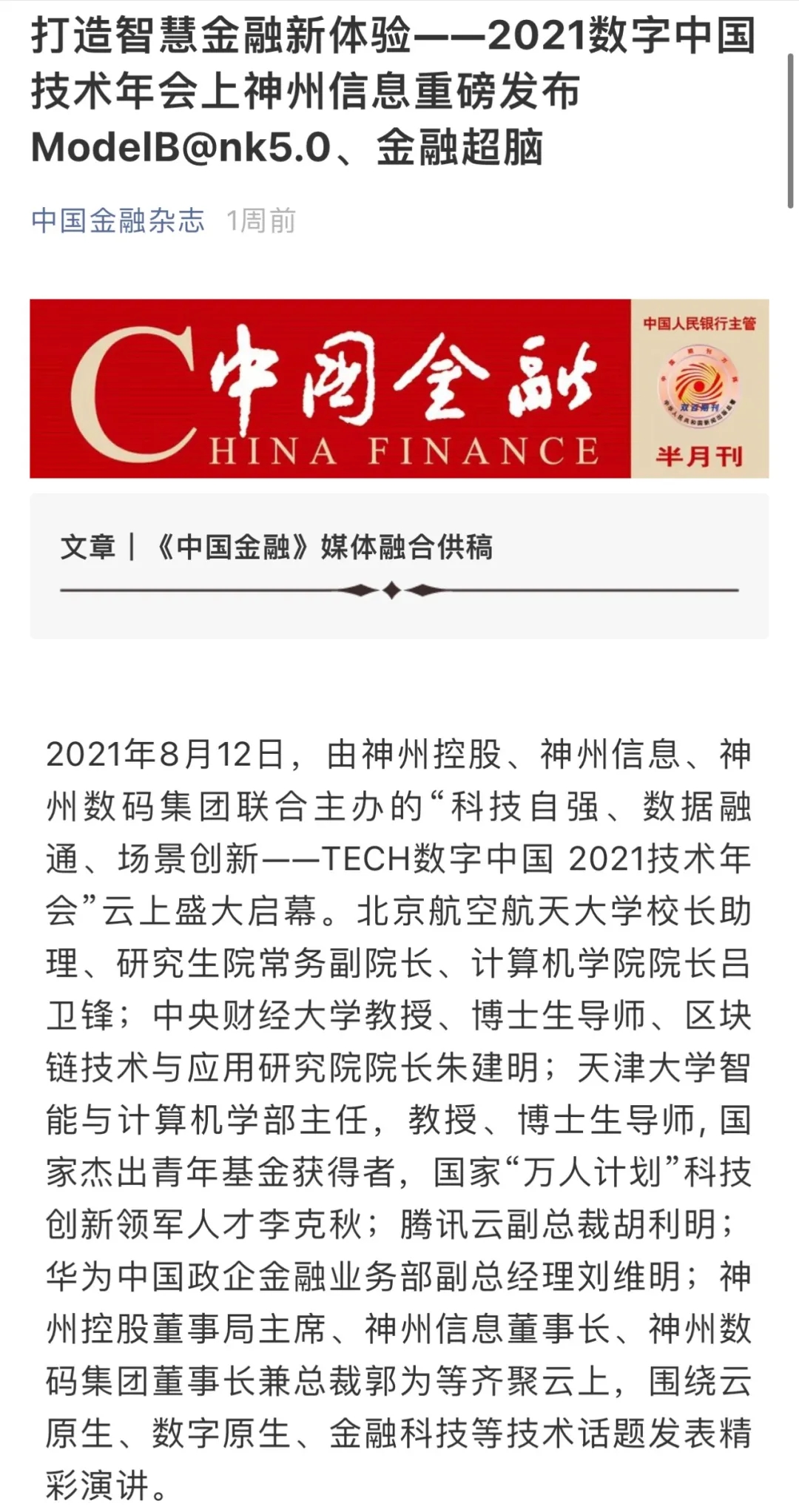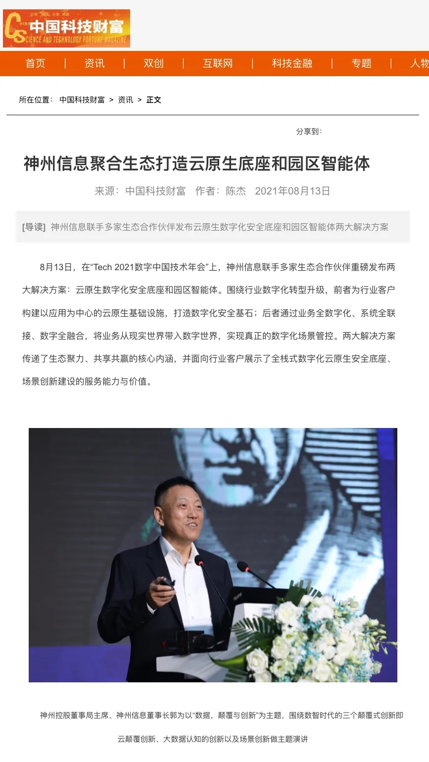 8月12日,由神州控股、神州信息、bbin宝盈集团联合主办的“科技自强、数据融通、场景创新——TECH数字中国 2021技术年会”云上盛大启幕,发布神州信创云、ModelB@nk5.0、金融超脑Sm@rtFSB、云原生数字化安全底座、园区智能体等重磅产品,国内各大权威、影响力媒体多角度多频次对盛况进行报道!